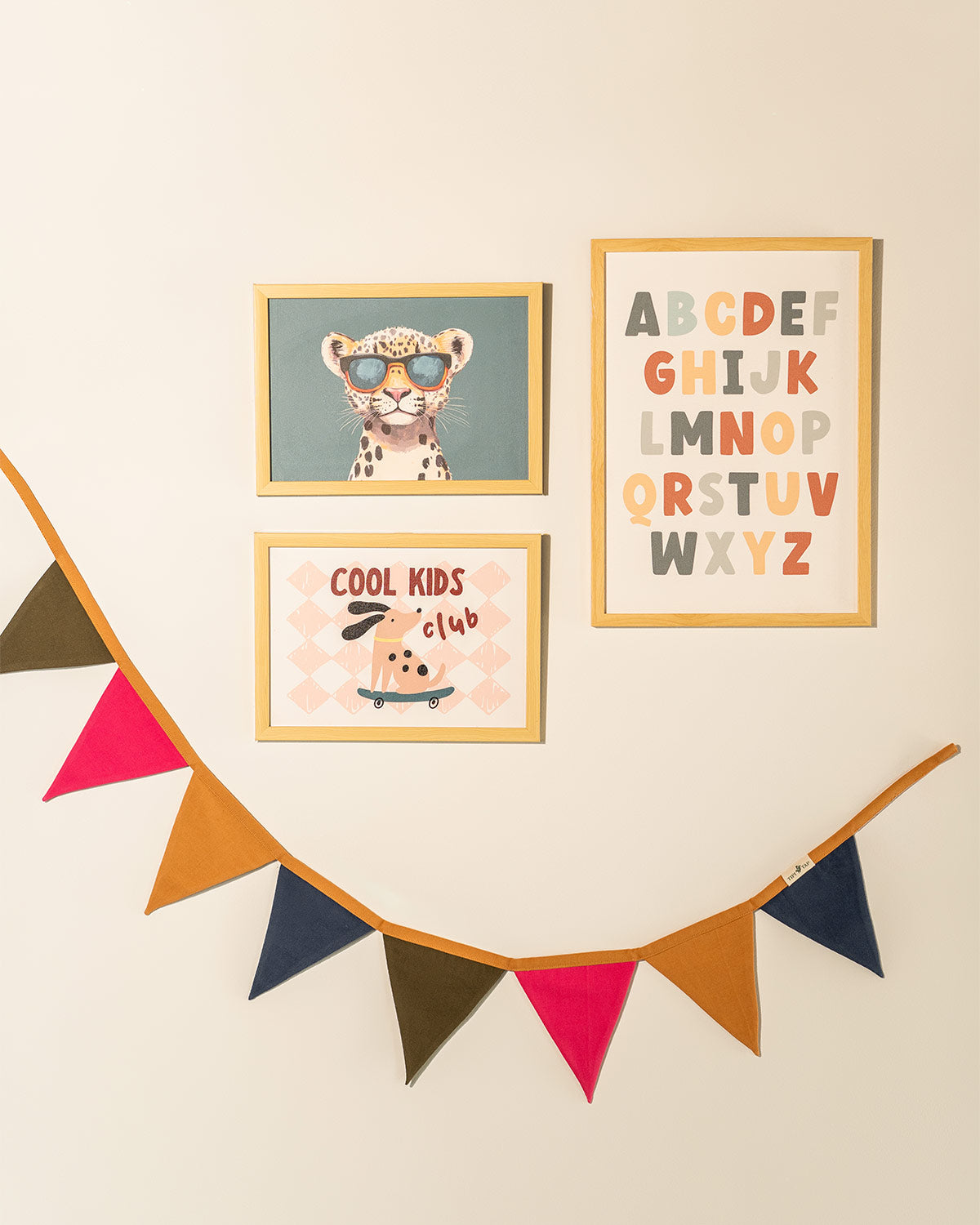 The Mini Magic Edit effortlessly elevates your child’s space with three animated canvas prints, thoughtfully finished and paired with a playful bunting for a perfectly styled look.