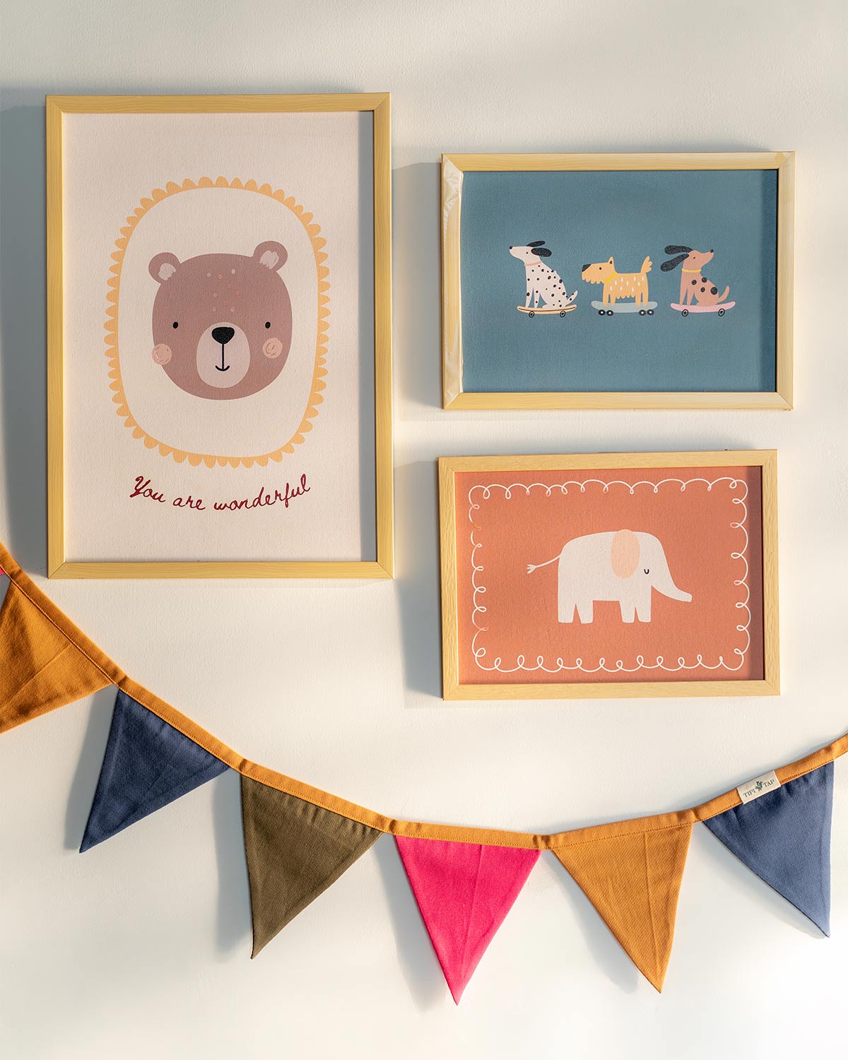 The Mini Magic Edit effortlessly elevates your child’s space with three animated canvas prints, thoughtfully finished and paired with a playful bunting for a perfectly styled look.