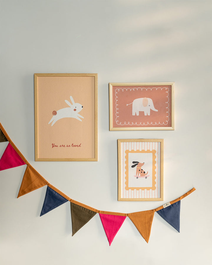 The Mini Magic Edit effortlessly elevates your child’s space with three animated canvas prints, thoughtfully finished and paired with a playful bunting for a perfectly styled look.